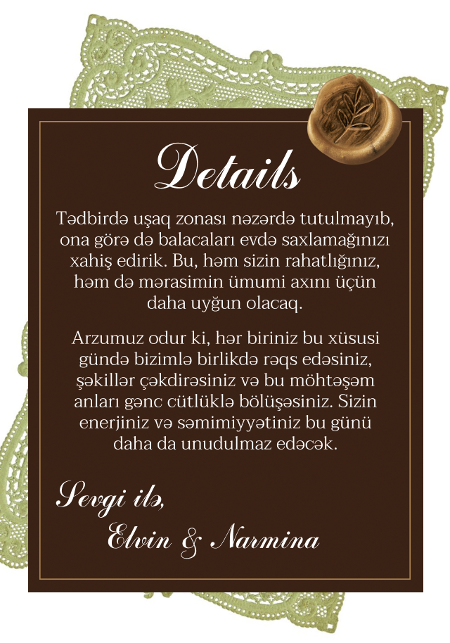 Saytda təqdim olunan bütün dəvət maketləri və dizaynları www.lovelyletters.az saytının intellektual mülkiyyətidir. Müəllifin razılığı olmadan kopyalanması və istifadə edilməsi qadağandır.